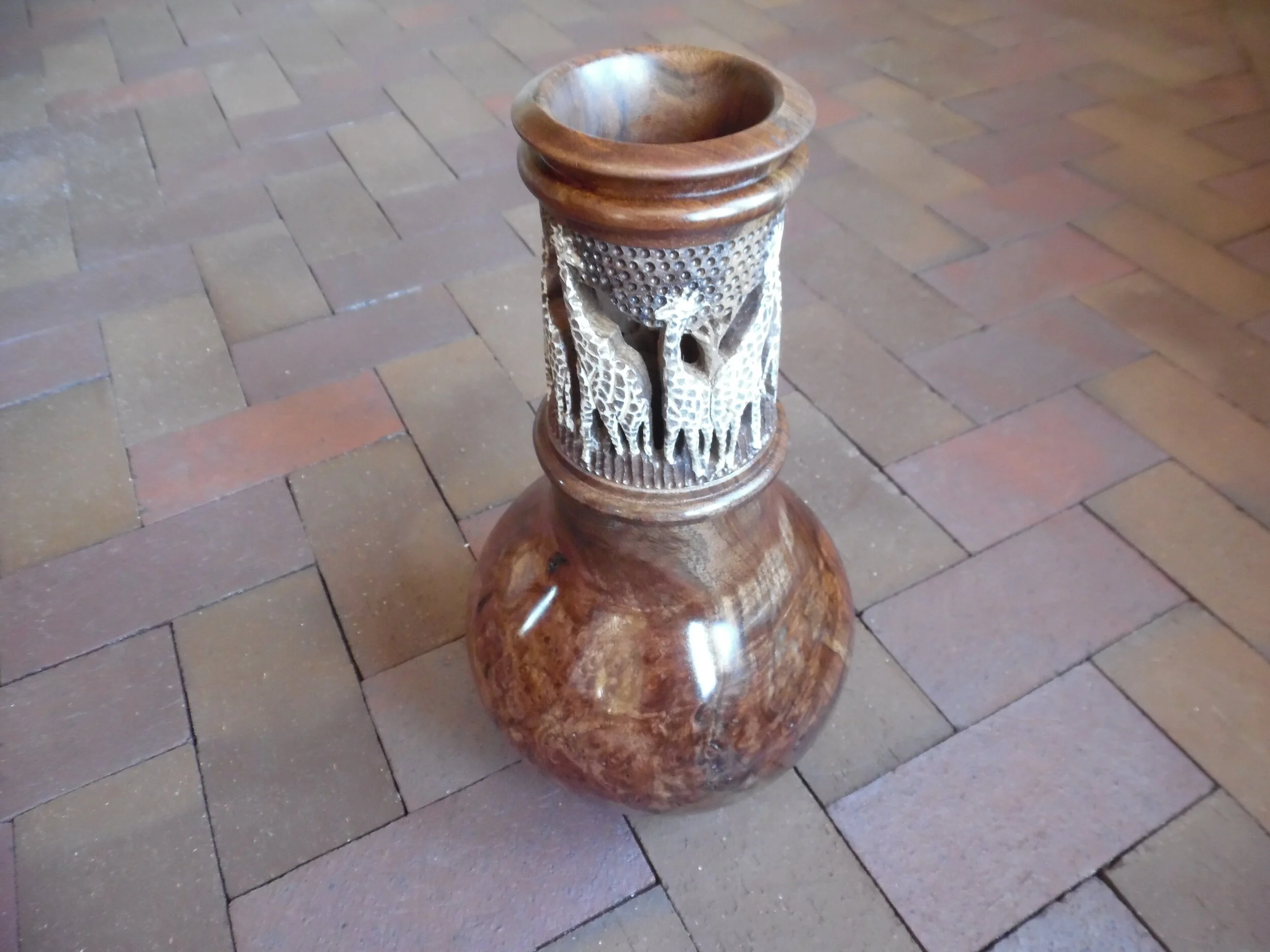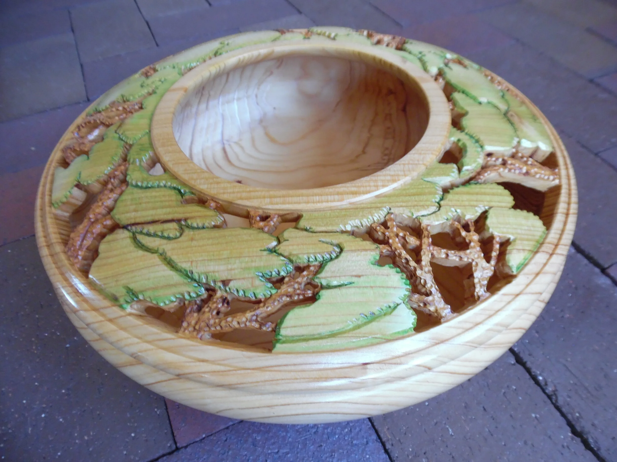 STYLE: Charlie’s distinctive hollow forms often share a similar shoulder shape and then depart from there. CARVING: Charlie begins with fretwork which allows for layers of carving and piercing to impart depth. EMBELLISHMENTS: Various methods of pyrography, dyes and finishes complete the work.